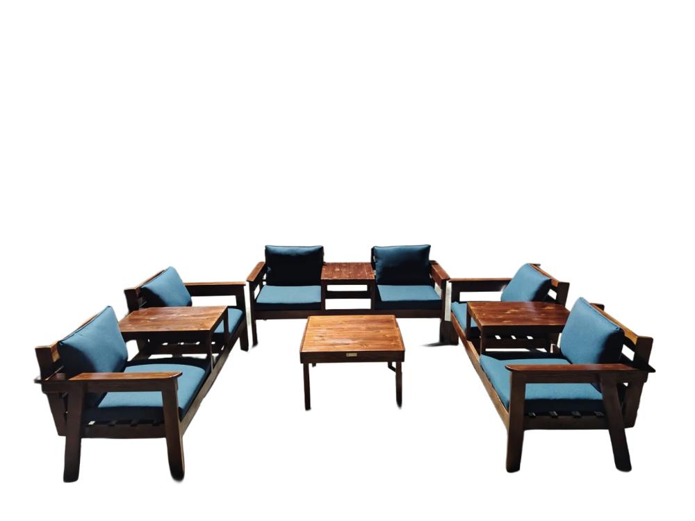 ✨ جلسة خارجية أنيقة تجمع بين المتانة والفخامة، مصنوعة من خشب طبيعي قوي مع تصميم عصري مريح.